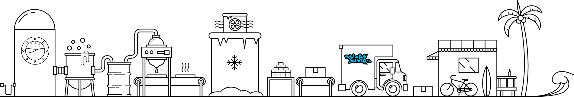 Sticky Bumps では、そこにカルサイト(炭酸カルシウム)、香料、そして独自のシークレットフォーミュラを加えることで、業界最高水準のワックスを生み出しています。